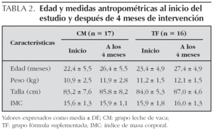 En el presente estudio se incluyeron en el estudio un total de 33 niños sanos con una edad media de 22,7 meses. El grupo TF estuvo integrado por 16 niños (9 varones y 7 mujeres) y al grupo CM fueron asignados 17 niños (10 varones y 7 mujeres). Durante el estudio, no hubo exclusiones por enfermedad o por ingesta de suplementos de hierro. En la tabla 2 se recogen los datos correspondientes a ambos grupos de niños. No existieron diferencias significativas entre ellos en cada tiempo del estudio y el incremento en peso y talla fue similar en los grupos de niños incluidos en el estudio.