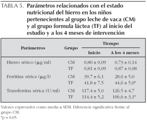 El principal hallazgo de este estudio fue que los niños sanos de 1-3 años de edad alimentados con una fórmula láctea suplementada con hierro durante 4 meses mantienen un mejor estado nutricional del hierro que los alimentados con leche de vaca, sin que parezca existir influencia sobre el crecimiento.