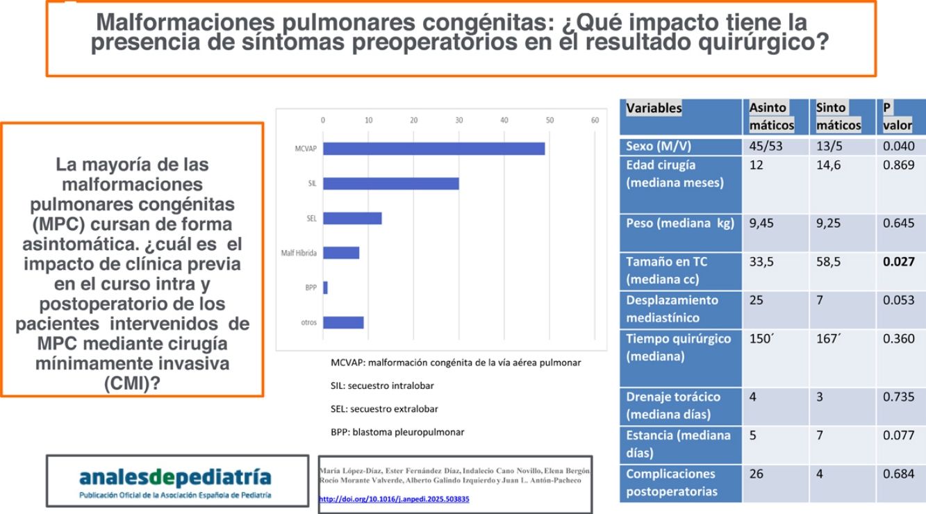 En conclusión, aunque los resultados obtenidos en nuestro estudio no demuestran un aumento significativo de las complicaciones postoperatorias en el grupo de pacientes con clínica previa, ciertos aspectos como el índice de conversión a cirugía abierta podrían demostrar que una intervención precoz sería beneficiosa. Además, las lesiones más voluminosas detectadas en la ecografía prenatal y confirmadas en la TC torácica posnatal tienen un riesgo significativamente mayor de desarrollar sintomatología, por lo que son también candidatas a una resección quirúrgica antes de cumplir el año de vida.