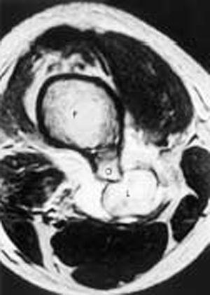 Pruebas complementarias. Se realizó una radiografía lateral del fémur derecho (fig. 1) que mostró la exostosis asociada a un aumento del espesor de las partes blandas no visualizado en las placas de meses anteriores. Se practica un estudio ecográfico (fig. 2) de la zona que demuestra una lesión hipoecoica redondeada, de 5 cm de diámetro aproximado, en relación con la arteria poplítea con flujo arterial turbulento en su interior, confirmada con Doppler color y pulsado. Ante la sospecha diagnóstica se solicitó una RM (fig. 3) que demostró la lesión quística, con zonas de vacío de señal por flujo en su interior, relacionadas con el extremo distal del osteocondroma.