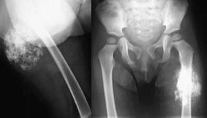 Niña de 22 meses, sin antecedente traumático previo, que presenta una tumoración indolora en cara posterior de muslo izquierdo. La masa es de consistencia leñosa, sin signos inflamatorios.