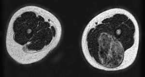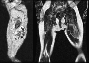 En la RM la masa está contenida en el bíceps crural izquierdo, sin afectación ósea asociada (Figura 2). Internamente se apreciaban áreas irregulares de vacío de señal (Figura 3) (hipointensas en todas las secuencias), secundarias a la presencia de calcificaciones (flechas).
