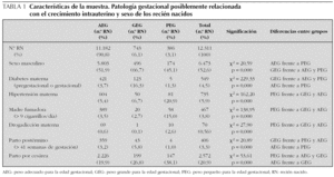 En la tabla 1 se recogen las características de la muestra, enfermedad gestacional relacionada con el crecimiento intrauterino y resultados del estudio estadístico. En los hijos de madre diabética existió un incremento significativo de GEG en relación con el conjunto de la muestra y, por el contrario, existió una mayor tasa de recién nacidos PEG cuando existían antecedentes maternos de hipertensión, tabaquismo o drogadicción que cuando no había dichos antecedentes.