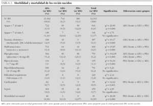 En la tabla 2 se refieren los datos de morbilidad y mortalidad neonatal, así como los resultados del estudio estadístico y las diferencias entre los grupos según el patrón de crecimiento intrauterino. En los recién nacidos GEG se observa un incremento significativo de la incidencia de traumatismos obstétricos, hipoglucemia e hipocalcemia en relación a los AEG y PEG. Por el contrario, en los PEG la tasa de malformaciones congénitas, cardiopatías congénitas y mortalidad neonatal fue significativamente más elevada.