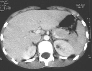 Figura 2.TC abdominal con contraste intravenoso. Se observa un área hipocaptante de 1 cm de diámetro localizada en polo superior de riñón izquierdo, compatible con absceso.