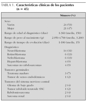 Durante el período 1999-2003, fueron atendidos en el servicio de oncología del hospital 422 pacientes con diagnóstico de neoplasia maligna, de los cuales 45 (11 %) eran menores de un año de edad. Sus características clínicas se presentan en la tabla 1.