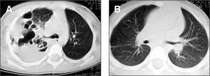 Varón de 2 años, que ingresó por fiebre de 41 °C, tos, diarrea y rechazo alimentario. Presentaba un regular estado general, 36 resp./ min, 120 lat./min, temperatura 39,8 °C, palidez y sudoración. A la auscultación existía soplo tubárico en hemitórax derecho y semiología de derrame pleural en el tercio inferior y zona paraescapular, siendo el resto normal. La analítica reveló 17.300 leucocitos/μl con desviación a la izquierda; sodio, 132 mmol/l; proteína C reactiva, 15,7 mg/dl, y dímero D > 7 μg/ml. La gasometría arterial fracción inspiratoria de oxígeno (FiO2) al 21 % mostró pH, 7,37; PO2, 31,2 torr; PCO2, 39,3 torr; HCO3, 22 mmol/l y saturación del 58 %. En la radiografía de tórax se observó una opacidad en hemitórax derecho, broncograma aéreo en lóbulo medio y lóbulo inferior derecho y condensación alveolar en lóbulo superior derecho con derrame organizado (fig. 1A). Se inició oxigenoterapia, antitérmicos, cefotaxima 200 mg/kg/24 h i.v. y vancomicina 15 mg/kg/6 h i.v. La radiografía del tercer día mostró desplazamiento mediastínico contralateral a expensas de derrame pleural e imágenes areoladas en lóbulo superior derecho, con loculación y organización, y se consultó a la UCI para inserción de tubo de drenaje. El líquido pleural presentaba aspecto purulento; pH, 7,26; 660 leucocitos/μl (95 % polimorfonucleares), glucosa, 2 mg/dl; proteínas, 3,8 g/dl, y LDH 7.090 U/l. Los cultivos, el Ziehl y Löwenstein fueron negativos, así como los hemocultivos, y la prueba de tuberculina. Tras la inserción del tubo torácico, en la radiografía se apreció derrame loculado e imagen cavitada de paredes gruesas, instilándose durante 2 días consecutivos 100.000 U de urocinasa intrapleural. A las 48 h, y habiendo drenado mínimamente, en una ecografía se apreció ausencia del tubo en la cavidad pleural, extrayéndose el mismo. Durante los 6 días siguientes continuó séptico y la radiografía mostró múltiples niveles hidroaéreos por loculaciones pleurales y cavitaciones en lóbulo superior derecho (fig. 1B). En la TC torácica (fig. 2A) se confirmó amplia destrucción con necrosis parenquimatosa en lóbulo superior derecho y colapso del lóbulo inferior derecho con sinequia pleural anterior en el seno del empiema, por lo que se colocó nuevo tubo torácico. El drenaje fue prácticamente nulo en los días siguientes. Una segunda TC torácica reveló que el tubo estaba nuevamente fuera de la cavidad pleural. En este momento (día 13 de ingreso), se consultó con neumología, y se decidió insertar un tercer tubo de drenaje, con control exhaustivo, obteniendo 475 ml de líquido purulento acompañado de burbujeo persistente con la aspiración, traduciendo la presencia de fístula broncopleural. El paciente presentó una mejoría clínica y radiológica espectacular, con reexpansión pulmonar y resolución de las lesiones cavitarias de lóbulo superior derecho. Al mes y medio del alta, la TC mostró desaparición de las cavidades, con tractos fibrosos y refuerzo pleural, y a los 8 meses ausencia de lesiones (fig. 2B).