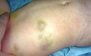 Figura 2. Nódulos de aspecto equimótico sobre la región costal del paciente.