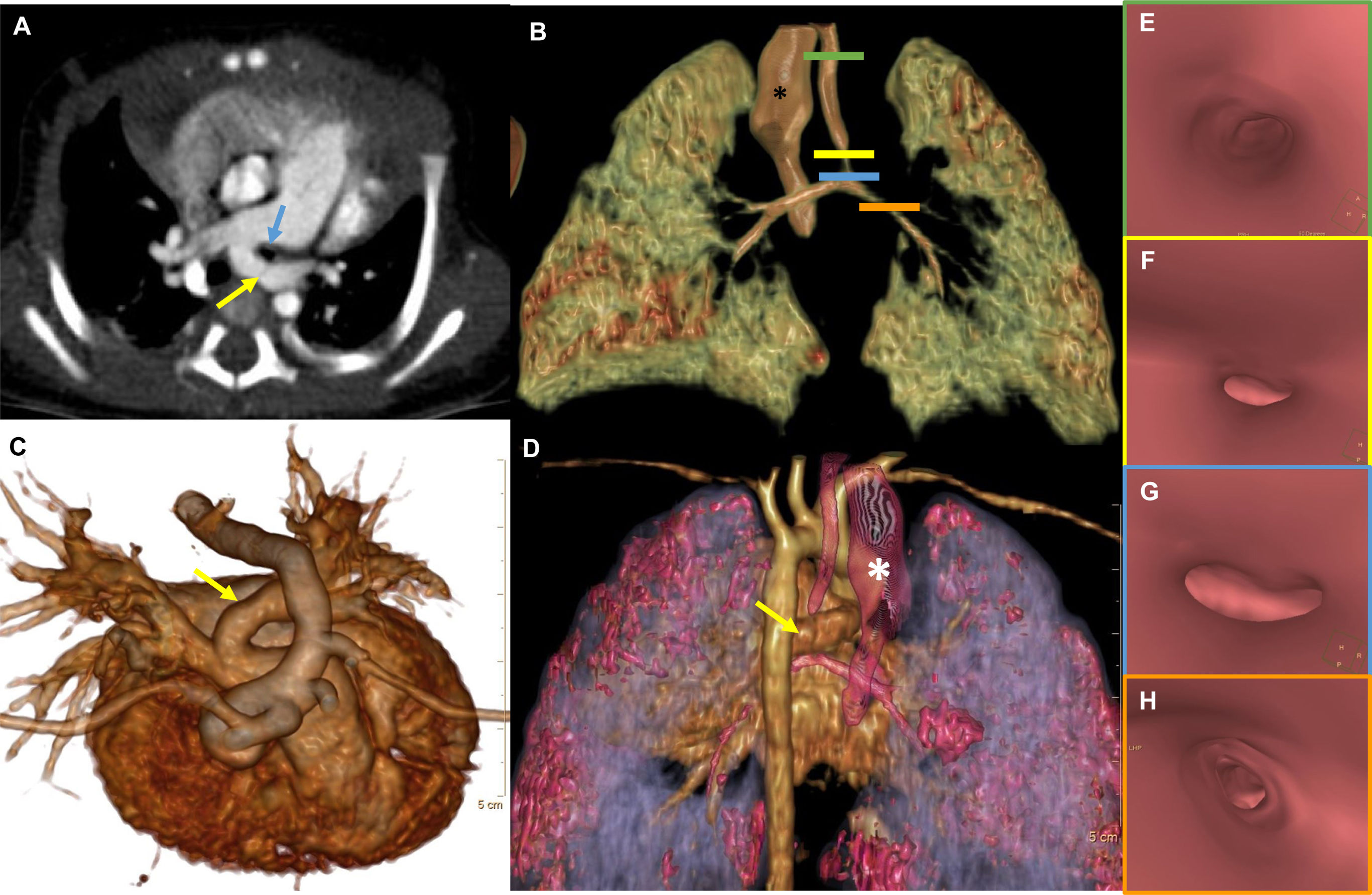 Imagen de TC axial (A) que muestra el origen anómalo de la arteria pulmonar izquierda (flecha amarilla) en la arteria pulmonar derecha, y su curso rodeando el bronquio principal izquierdo (flecha azul), consistente con sling de la arteria pulmonar izquierda. Imágenes con reconstrucción 3D (B, C, D) que muestran el curso de la arteria pulmonar izquierda (flecha amarilla; C, D) en relación con las vías aéreas (B, C, D). Se puede apreciar la dilatación del esófago (asterisco blanco) (D). Imágenes de endoscopia virtual (E, F, G, H) que muestran la tráquea (E), con estenosis significativa de la tráquea (F), la bifurcación bronquial (G) y el bronquio izquierdo (H).