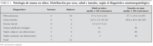 Entre 2001 y 2006 se han recibido 21 biopsias de mama correspondientes a pacientes menores de 14 años en el servicio de Anatomía Patológica del Hospital Universitario Virgen del Rocío. Se han recogido los siguientes datos: sexo, edad, resultado de la punción aspirado con aguja fina (PAAF), en los casos en que ésta se realizó, tamaño de la lesión y diagnóstico anatomopatológico.