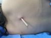 The thoracoscopy allowed visualization of a penetrating injury caused by a pencil (Fig. 3), damage to the lower lobe and haemothorax. The pencil was removed, the cavity cleaned and a pleural drainage tube inserted that was subsequently withdrawn at 36 hours, followed by discharge of the patient on the same day. The outcome was favourable, and the patient resumed normal physical activity in 14 days.
