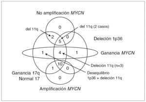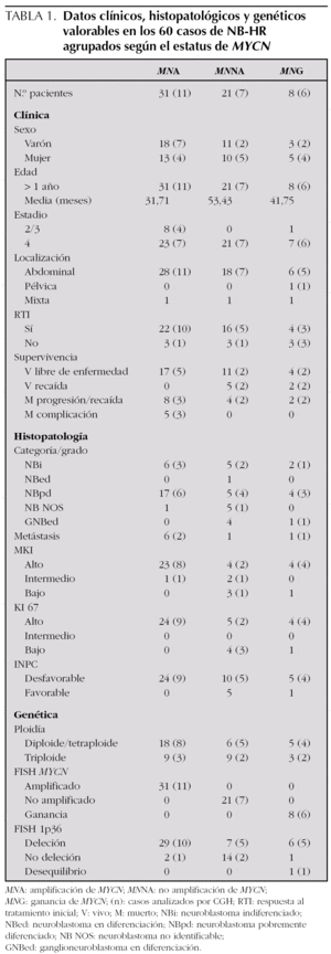 El grupo 1 se identifica y define por la presencia de MNA sin detectar otros hallazgos genéticos específicos. Se observa la integridad de 11q. Presentan muy pocas alteraciones genómicas, indicando que MNA es suficiente para determinar en estos tumores un fenotipo agresivo, aunque ocurren otros cambios genéticos, incluidos del 1p36 y +17q. La del 1p asociada a MNA afecta a regiones amplias y tiene como consecuencia la pérdida de múltiples genes. Dentro de los NB-HR los pacientes de este grupo presenta una media de edad al diagnóstico menor (39,09 meses) y progresan rápidamente. El grupo 2 presenta mayor número de anormalidades estructurales, y está presente entre éstas la del 11q. Estos casos están incluidos tanto en el grupo MNNA como en el grupo de MNG. Por tanto se considera que los tumores con del 11q forman un subgrupo diferenciado de tumores que a su vez pueden o no presentar asociada MNG, del 1p, del 3p o del 14q. Los tumores incluidos en este subgrupo crecen más despacio, la media de edad al diagnóstico es mayor (52 meses) y por tanto acumulan mayor número de anormalidades genéticas secundarias, presumiblemente por el tiempo más largo de evolución. El grupo de tumores que no presentan MNA ni del 11q sigue siendo un grupo genéticamente heterogéneo, en donde no se puede detectar con la técnica de CGH metafásica anomalías comunes identificativas, aunque sí están presentes la +17q y/o el cromosoma 17 en disomía.