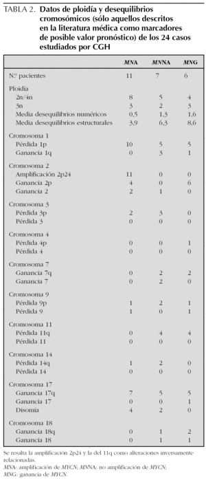 La MNA (fig. 2) presente en 11 casos (45,8 %) se asocia a del 1p36 en aproximadamente el 91 % (10/11) y +17q (63 %; 7/11) o cromosoma 17 en disomía (36 %, 4/11). La MNA (región 2p24) está asociada a ganancia de otras regiones del brazo corto del cromosoma 2 (p21-23) o ganancia completa del cromosoma 2. La del en 1p se limita a la región 1p36 en un caso y es mayor en el resto de casos (en tres de ellos es completa). Únicamente en un caso el cromosoma 1 está sin del. Estos casos MNA presentan pocas ganancias y pérdidas completas cromosómicas y un número escaso de reestructuraciones parciales del resto de cromosomas (media de 3,9 reestructuraciones por tumor). Un caso presenta del 3p22 y en otro caso se observa una del 14q31 estando ausente en todos los casos la del 11q. Ocho de estos casos son diploides y tres triploides. Todos los casos según la INPC presentan un pronóstico histológico desfavorable y todos excepto uno presentan un alto MKI junto con una alta expresión de Ki67. La edad media al diagnóstico es de 39,09 meses. A pesar de que todos los enfermos excepto uno respondieron inicialmente al tratamiento, fallecieron 5 enfermos por progresión y uno por complicaciones.