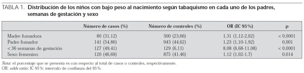 La prevalencia de embarazadas fumadoras en nuestra población es similar a la descrita en un estudio previo en Barcelona 11, pero mayor a la de otros países 12,13. En cuanto al número de padres fumadores durante el embarazo, en estudios previos el valor oscila alrededor del 50 % 14 (46 % en el nuestro). Y con respecto a los recién nacidos de bajo peso, la prevalencia en nuestro estudio (10 %) se puede considerar similar respecto a la población general, en la que la cifra oscila entre el 30 % en algunos países en vías de desarrollo y el 10 % en países industrializados 15.
