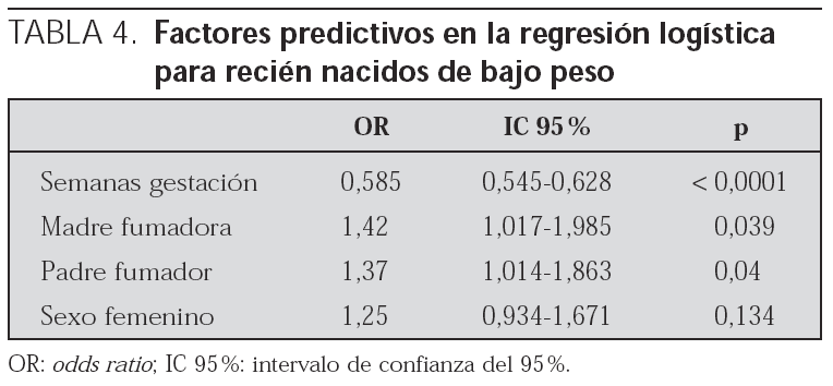 Los resultados de la regresión logística fueron que fumar durante la gestación se asocia con un riesgo aumentado de bajo peso al nacimiento (odds ratio [OR]: 1,42; IC 95 %: 1,017-1,985), así como tener una pareja fumadora (OR: 1,37; IC 95 %: 1,014-1,863) (tabla 4). La edad gestacional por encima de las 36 semanas resultó ser un factor protector de bajo peso (OR: 0,585; IC 95 %: 0,545-0,628) y en cambio, el porcentaje de niños con bajo peso no fue significativamente distinto según el sexo (OR: 1,25; IC 95 %: 0,934-1,671).