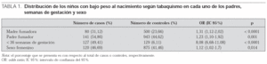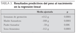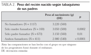 Comparando entre sí los pesos de los niños según el/los progenitor/es fueran fumador/es, se obtuvieron los siguientes resultados: los niños sin ningún padre fumador tenían un peso medio al nacimiento de 3.220 g (DE: 560 g), y aquellos en los que sólo fumaba su madre pesaban por término medio 3.050 g (DE: 500 g). En el grupo en el que sólo el padre era fumador, el peso medio de los niños fue de 3.150 g (DE: 560 g), y si los dos progenitores fumaban, la media de los pesos al nacimiento fue de 2.980 g (DE: 540 g). Al comparar el peso del grupo de niños sin padres fumadores con el peso del resto de grupos por medio del test de la t de Student, todas las diferencias resultaron ser estadísticamente significativas (tabla 2).