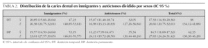 La incidencia de caries en dentición temporal en inmigrantes fue de 47,23 % frente a 32,05 % en autóctonos. Así mismo, la incidencia para las caries en dentición permanente también fue mayor en inmigrantes (53,19 %) frente a autóctonos (35,34 %). La proporción más elevada de niños frente a las niñas presentando alguna caries dental en inmigrantes como autóctonos es estadísticamente significativa en dentición permanente pero no en dentición temporal. La proporción más elevada de inmigrantes presentando caries dental frente a autóctonos es estadísticamente significativa tanto para dentición permanente como temporal.