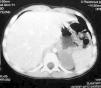 Ante la sospecha de neoplasia adrenocortical productora de andrógenos se solicitan hormona adrenocorticotropa (ACTH) 20 pg/ml (valor normal [VN]: 10-55 pg/ml), cortisol basal plasmático 8,9 µg/dl (VN: 7-26 µg/dl), testosterona 2,5 ng/ml (VN = < 1 ng/ml), deshidroepiandrostendiona sulfato (SDHEA) 615 µg/dl (VN: 82-300 µg/dl). Con objeto de descartar el neuroblastoma así como la existencia de metástasis, se realizan catecolaminas en sangre y orina (normales) y una tomografía computarizada (TC) que confirma los hallazgos ecográficos sin encontrarse invasión aparente de áreas vecinas ni metástasis en hígado o pulmón (fig. 2).