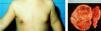 A) Lactante de 18 meses de edad que, en el momento del diagnóstico, presenta aceleración del crecimiento desde hace 5 meses (talla en +5 SDS), acompañada de telarquia bilateral y sangrado vaginal. Nótense la telarquia y el incremento de pigmentación areolar bilaterales. B) Pieza de ovario izquierdo. El estudio anatomo-patológico reveló que existía un luteoma.