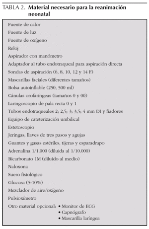 En la tabla 2 se expone el material imprescindible para la reanimación neonatal en la sala de partos y en el quirófano 8. El material debe ser revisado y repuesto después de cada reanimación. Además, antes de cada parto, el equipo que va a intervenir en la reanimación debe comprobar el correcto equipamiento y funcionamiento del mismo, y debe mantener el paritorio a temperatura adecuada (25 °C) con las puertas y ventanas cerradas. Antes de que nazca el niño se debe encender la fuente de calor y precalentar unas toallas o paños.