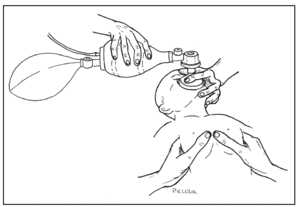 Técnica: en ocasiones las primeras insuflaciones deben hacerse con una presión más alta (≥ 30-40 cmH2O) prolongando unos segundos el tiempo de insuflación. Después continuar a un ritmo de 30 a 60 resp./min (30 resp./min si se realizan masaje y ventilaciones simultáneamente). Debe valorarse la eficacia de la ventilación comprobando el aumento de la frecuencia cardíaca que es el mejor indicador de que la ventilación es adecuada, el desplazamiento de la pared torácica y auscultando la entrada de aire en el pulmón. Si la ventilación con bolsa y mascarilla se prolonga más de 2 min, puede ser necesaria la colocación de una sonda nasogástrica para evitar la distensión gástrica.
