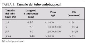 Tubo endotraqueal: en la tabla 3 se recoge el calibre más adecuado del tubo según el peso del recién nacido, sin bien, es aconsejable disponer de tubos de calibre 0,5 mm mayor y más pequeño del deseado.