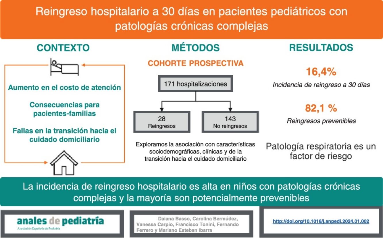 ObjetivosEstimar la tasa de incidencia de reingreso hospitalario a 30 días en pacientes pediátricos con enfermedades crónicas complejas, estimar cuántos son potencialmente prevenibles y explorar posibles factores asociados a reingreso.
