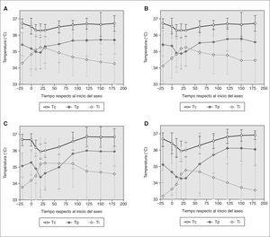 Un aspecto relevante es que la marcada y significativa reducción de la temperatura corporal observada durante y después del aseo, así como el prolongado período con Td > 1 °C, tuvo lugar a pesar de los intentos de reducir el estrés térmico mediante la estandarización de medidas dirigidas a aminorar la pérdida de calor. Esto debe tenerse en cuenta ya que al no ser un estudio ciego a los cambios que acaecían en la temperatura durante el aseo, la magnitud de los cambios pudo ser amortiguada por actitudes activas de calentamiento. Así, aunque el protocolo de aseo establecía un aumento de la temperatura de la incubadora de 1 a 2 °C durante este, en el estudio el incremento fue de casi 3 °C por termino medio. La tendencia observada a una mayor magnitud en el descenso de la Tp durante la segunda semana puede ser debida a la maduración de la respuesta vasomotora al estrés térmico 4. Es preciso señalar que durante el procedimiento no fue posible monitorizar los cambios que tenían lugar en la humedad medioambiental, ni se tomaron medidas tendentes a su aumento.