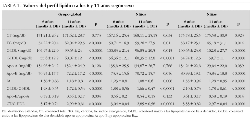 Según el sexo, en los niños se encontraron los mismos cambios excepto en que las apo-B y el cociente apo-B/apo-A no presentaron significación estadística. Las niñas presentaron además una disminución significativa de los valores de apo-A.