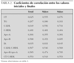 Los coeficientes de correlación entre los valores iniciales y finales (tabla 2) presentaron una elevada significación estadística (p < 0,0001), que para los TG en los niños fue de p = 0,028. Los mayores coeficientes de correlación se encontraron en las niñas (C-LDL, apo-B/apo-A, CT, apo-B e IA) (tabla 2).