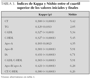 Todos los índices Kappa de tracking presentaron significación estadística. Los mayores valores para los índices de tracking Kappa y Nishio se encontraron en los índices IA, apo-B/apo-A, C-LDL/C-HDL, apo-B y CT/C-HDL (tabla 3).