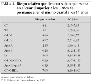 El riesgo relativo que tenían los niños estudiados que se encontraban en el cuartil superior a los 6 años de estar situados en el mismo a los 11 años se recoge en la tabla 4, siendo los mayores valores para el IA y CT/C-HDL.