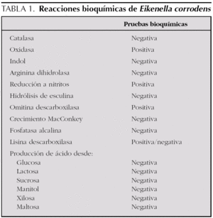 Para conseguir la correcta identificación de la bacteria, una vez comprobado que el Vitek 2® System arrojaba dudas sobre la identificación, se procedió a hacer una batería de pruebas bioquímicas automáticas mediante el Vitek® System (bioMérieux España S.A), identificando el microorganismo como Eikenella corrodens con un porcentaje de acierto del 99 %. Este dato concordaba tanto con la morfología de la colonia como con la sensibilidad obtenida y las pruebas de la oxidasa y la catalasa.