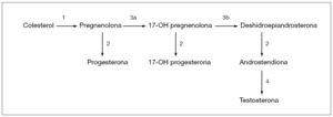 Figura 2. Síntesis de testosterona. 1: P450scc; 2: 3bhidroxiesteroide deshidrogenasa; 3: P450c17 con actividad hidroxilasa (3a) y con actividad desmolasa (3b); 4: 17b hidroxiesteroide deshidrogenasa.