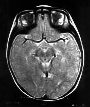 Las exploraciones complementarias realizadas fueron normales: hemograma, bioquímica sérica elemental, creatinfosfocinasa, ácido láctico, piruvato, aminoácidos en suero, ácidos orgánicos en orina, ácidos grasos libres en plasma, carnitina sérica total, carnitina libre, acilcarnitina, cociente acil/libre, equilibrio acidobásico, amonio, hormonas tiroideas, cariotipo, citoquímica de líquido cefalorraquídeo, electromiograma y velocidad de conducción motora de nervio peroneo, biopsia de músculo con estudio estructural, histoquímico y de cuantificación de enzimas de la cadena respiratoria mitocondrial, estudio del ADN mitocondrial de músculo en búsqueda de las mutaciones T8993G, T8993C y A9176C, deleciones únicas o múltiples y depleción por Southern blot, test de edrofonio, estudio de potenciales evocados auditivos del tronco cerebral y una tomografía computarizada (TC) craneal (fig. 1). Se realizaron tres estudios de resonancia magnética (RM) craneal a los 7, 9 y 15 meses de vida que mostraron alteración en la intensidad de la señal en tegmento mesencefálico, pontino y bulbar, más marcado en regiones dorsales (figs. 2 y 3).