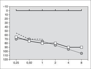 Se inició corticoterapia local con metilprednisolona intratimpánica en dosis de 15 mg/día 10 días consecutivos, existiendo sólo discreta recuperación y desapareciendo el acufeno. Posteriormente se administró deflazacort oral en dosis de 1 mg/kg/día 14 días y disminución progresiva 10 días más, sin que existiera modificación en el perfil audiométrico, inalterable hasta hoy (fig. 1).