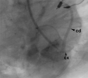 Figura 2. Aortografía. La coronaria derecha nace del seno postero derecho y de ella nace la arteria circunfleja. Cx: coronaria circunfleja (cabeza de flecha pequeña); cd: coronaria derecha (cabeza de flecha grande).