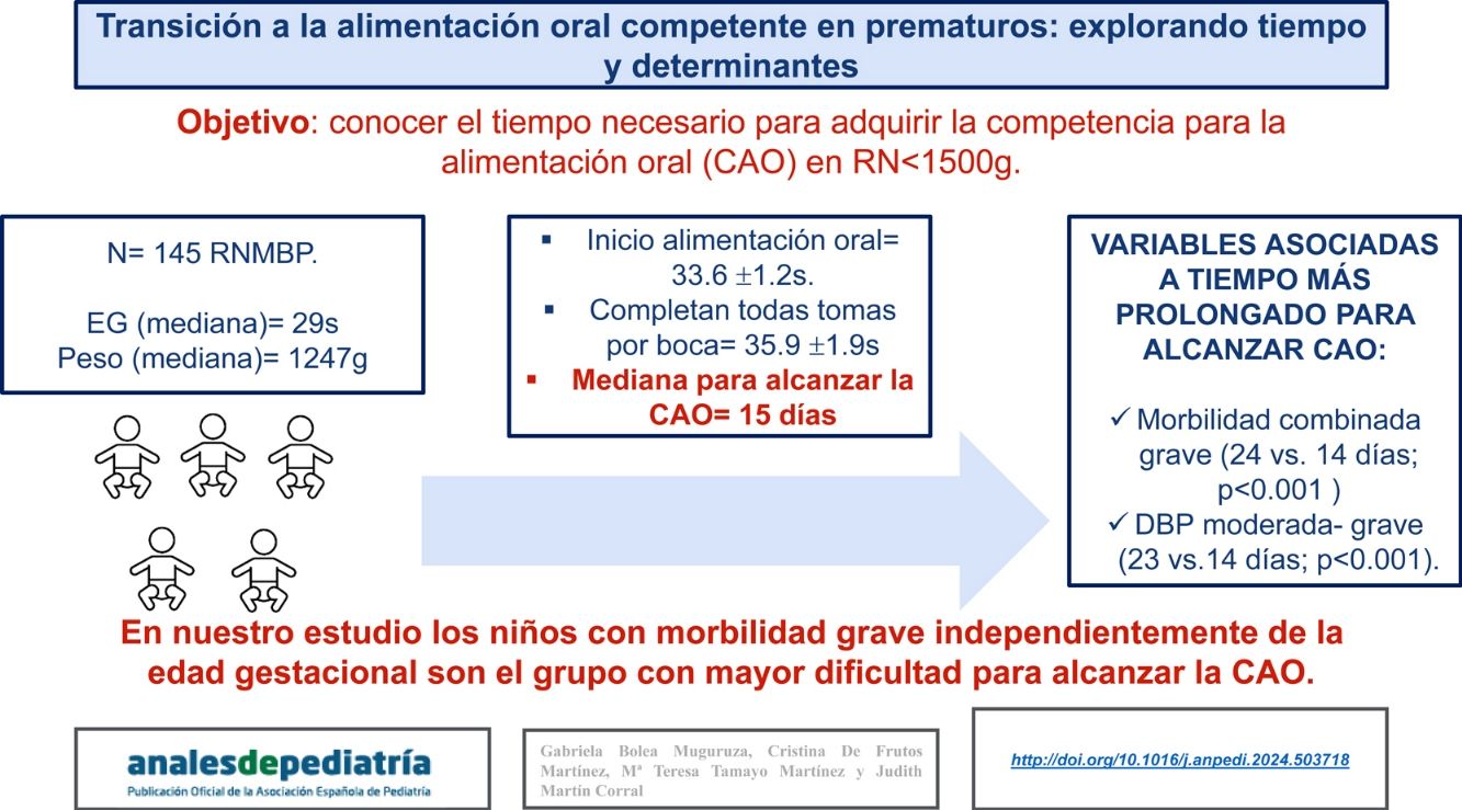 ConclusionesResaltamos la importancia de estructurar el proceso de transición a la alimentación oral e identificar a la población de más riesgo, que en nuestro estudio fueron los niños con morbilidad grave independientemente de la edad gestacional, para dirigir a ellos las posibles intervenciones.