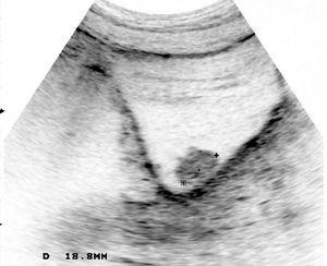 Figura 1. Ecografía vesical: lesión ocupante de espacio, exofítica, en la pared vesical derecha, de unos 4 cm de diámetro.