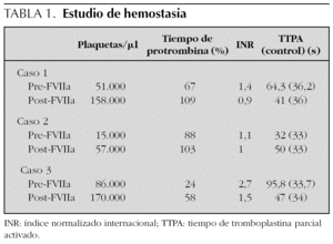 Varón de 4,5 años de edad con neurofibromatosis tipo I, diagnosticado de leucemia mielomonocítica crónica juvenil hacía 6 meses. Fue tratado con protocolo SHOP-LANL 2001 (arabinósido de citosina [ARA-C] y mitoxantrona). En espera de esplenectomía y posterior trasplante de médula ósea, presentó reagudización de la enfermedad de base y neumonía con insuficiencia respiratoria aguda que evolucionó a síndrome de dificultad respiratoria agudo (SDRA). Durante la estancia en UCIP presentó una gran hepatomegalia, deterioro hemodinámico con oliguria y trombopenia persistente a pesar del tratamiento sustitutivo con transfusiones repetidas de plaquetas. La situación hemodinámica se estabilizó y la alteración respiratoria evolucionó hacia fibrosis pulmonar. A la tercera semana se realizó nuevo ciclo de quimioterapia con idarubicina, ARA-C y etopósido (VP16). Tres semanas más tarde se realizó esplenectomía, presentando durante la intervención hemorragia incoercible que no se controló con la administración de plasma fresco, plaquetas y vitamina K, por lo que se administró una dosis de FVIIaR a 60 μg/kg lo cual permitió terminar la intervención. El estudio de hemostasia pretratamiento y postratamiento se representa en la tabla 1. La evolución es mala, presentando nueva recaída de la enfermedad de base, por lo que se decidió limitar el esfuerzo terapéutico; el paciente falleció a los 60 días de ingreso en la unidad (a los 7 días de realizar la esplenectomía).