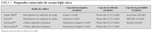 En los últimos años se han utilizado en España dos tipos distintos de vacuna triple vírica: las vacunas convencionales (Triple MSD® [Aventis Pasteur MSD] y Priorix® [Glaxo SmithKline]), cultivadas en fibroblastos de embrión de pollo, y una vacuna cultivada en células diploides humanas (Triviraten® [Berna Biotech])1. Las vacunas convencionales, por el medio de cultivo utilizado para su producción, pueden contener trazas de proteínas de huevo y tradicionalmente se había considerado que estaban contraindicadas en las personas alérgicas al huevo (tabla 1). En estos casos se aconsejaba administrar Triviraten® por estar libre de ellas.