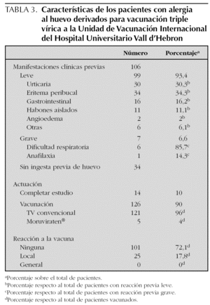 Se remitieron 14 pacientes al Servicio de Alergología para completar el estudio de su cuadro alérgico, y los 126 restantes fueron vacunados en la unidad: 121 recibieron la vacuna triple vírica convencional (fabricada en fibroblastos de embrión de pollo), tal como está indicado según las evidencias actualmente disponibles, y cinco niños recibieron la vacuna bivalente libre de huevo (Moruviraten®).