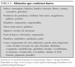 En la práctica clínica hay casos diagnosticados de hipersensibilidad a las proteínas de huevo que no han ingerido nunca dicho alimento y, por tanto, se desconoce qué reacción podrían presentar. Se trata generalmente de niños alérgicos a otros alimentos a quienes se detecta la hipersensibilidad al huevo durante el proceso diagnóstico, y a pesar de que el significado clínico del hallazgo pueda resultar dudoso24, se les indica una dieta de exclusión. En nuestra serie, hemos observado que más del 50 % de los pacientes era alérgico a otros alimentos, en especial a proteínas de leche de vaca. La actuación en este tipo de pacientes no se recoge en ningún protocolo. Es importante asegurar, mediante una historia clínica detallada, que el paciente no ha consumido nunca ningún alimento que contenga huevo (tabla 4). En caso de que se haya producido algún consumo inadvertido sin reacción alérgica, el paciente puede ser vacunado en atención primaria. Los pacientes que realmente no hayan consumido nunca huevo pueden ser derivados a un centro especializado, para mayor seguridad.