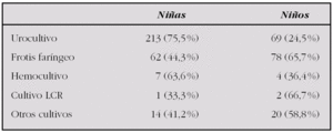 Comentarios: La incidencia de IBPS en los lactantes menores de 3 meses con fiebre sin focalidad que consultan en un SUP de nuestro entorno se sitúa alrededor del 18 %. La incidencia de infección urinaria es sensiblemente superior a la recogida en la literatura especializada, probablemente por tratarse exclusivamente de lactantes menores de 3 meses con fiebre sin focalidad.