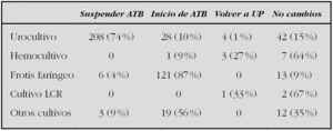 La media de días desde la recogida del cultivo y la llamada telefónica fue de 3,3 días (1-10). La indicación dada a los padres fue por tipo de cultivo: