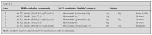Resultados: Con FISH se identificaron 5 pacientes con anomalías subteloméricas en desequilibrio (11 %). Con MLPA se obtuvieron resultados similares a excepción del paciente 5 en el cual la pérdida de 15q no fue detectada (tabla 1).