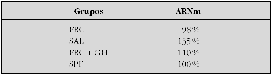 Resultados: Los animales FRC y FRC + GH tuvieron concentraciones séricas de urea similares y superiores a los grupos SAL y SPF. Los animales FRC fueron hipocrecidos mejorando el retraso de crecimiento en el grupo FRC + GH. Respecto a los niveles de ARNm de IGF-I y de NPY, estableciendo comparaciones entre grupos de los valores CT, se obtuvieron los siguientes resultados: