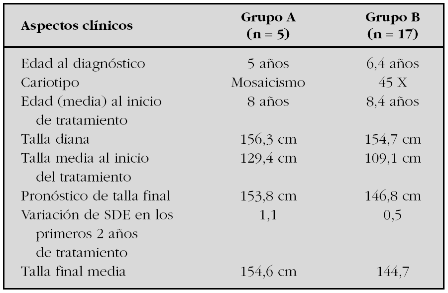 Resultados (12 meses): No hay diferencias estadísticas entre grupos en peso y longitud al nacer, edad gestacional, tallas de los padres, ni talla diana. La EC en la visita basal fue de 7,7 ± 2,7 años en el grupo TTO frente a 7,3 ± 2,5 años en NTTO. Se resumen los resultados en la siguiente tabla 1.