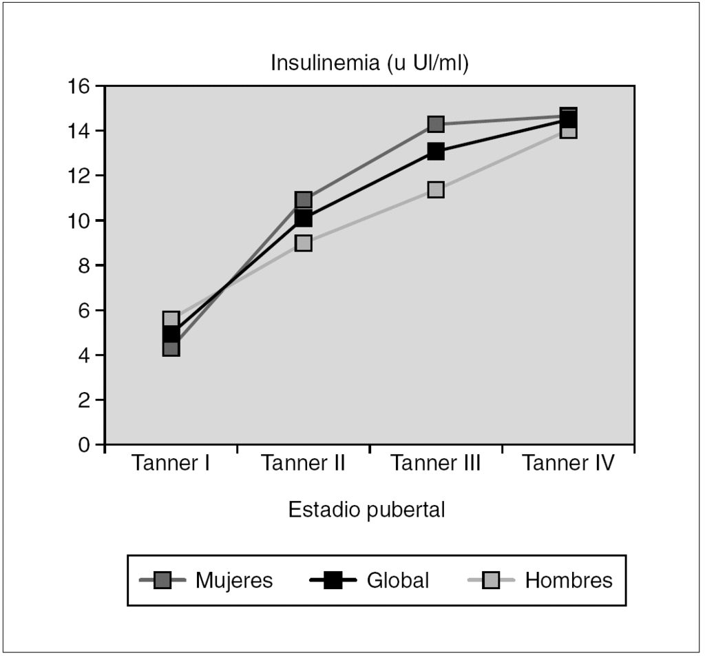 Conclusiones: Los valores de insulinemia, péptido C e índice HOMA aumentan con la edad y sobre todo con el estadio puberal para ambos sexos. No se encontraron diferencias significativas para cada uno de los parámetros entre sexos. La obtención de estos valores de referencia en nuestra población, dado el aumento de la prevalencia de ciertas patologías de riesgo cardiovascular, nos será de gran utilidad para un mejor diagnóstico clínico de nuestros pacientes.