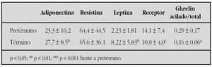 Resultados: Los recién nacidos a término presentaron concentraciones de adiponectina y leptina significativamente superiores a los pretérmino (p < 0,01 y p < 0,001, respectivamente). Por el contrario, mostraron concentraciones de receptor de leptina, así como el índice ghrelin acilado/ghrelin total significativamente inferiores (p < 0,05). No se observaron diferencias significativas en las concentraciones séricas de resistina. No se encontraron diferencias entre los grupos establecidos según el IP en ninguno de los parámetros estudiados, ni en recién nacidos a término ni pretérmino. Existe una correlación positiva entre la edad gestacional y las concentraciones de adiponectina y leptina en sangre de cordón (r = 0,39; p < 0,001, y r = 0,47; p < 0,001, respectivamente), así como una relación inversa entre leptina y su receptor soluble (r = 0,27; p < 0,01). El índice ponderal muestra una correlación directa con las concentraciones de leptina (r = 0,36; p < 0,001) e inversa con los de su receptor soluble (r = 0,30; p < 0,01).